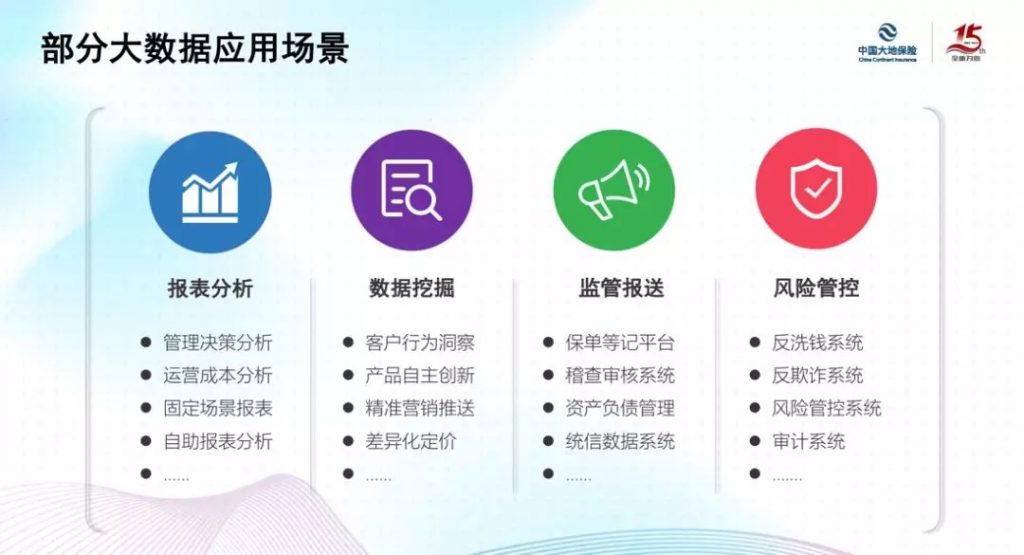 ●风险管控。在基于大数据甄别和预判风险方面,中国大地保险近年来持续探索,如基于SNA(社交网络分析)的反欺诈系统,被纳入中国保险业信息化建设典型案例。