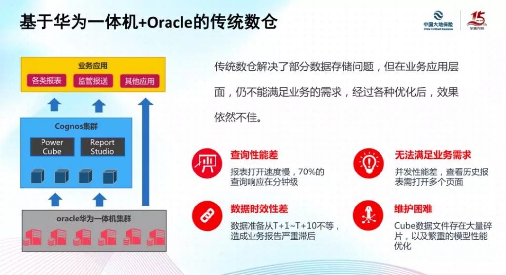 中国大地保险早在2014年之前就使用Oracle了,为提升Oracle的性能,在2014年引入华为一体机,并重新搭建数据仓库平台,不论是业务系统还是数仓、数据集市都建立在Oracle之上。