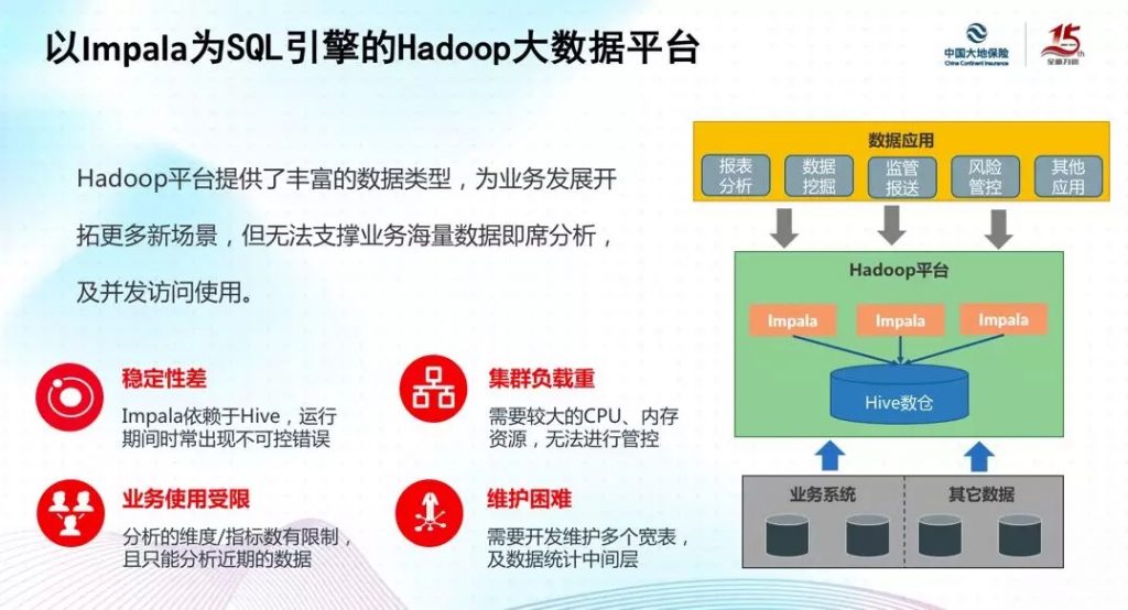 随着数据体量越来越大,基于Oracle的传统数据仓库越来越难以支撑业务发展,中国大地保险从2016年起开始探索Hadoop大数据平台的建设——最初搭建了包含5台服务器的集群,在经过实验后,将Oracle上的一些内容逐步转到Hadoop平台,同时把Impala作为SQL查询引擎。这样起步后,中国大地保险慢慢对Hadoop的应用范围越来越广,集群规模也日益扩大,但与此同时也暴露处Impala的一些问题。