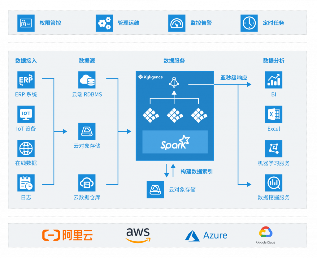 数据源无缝接入:深度整合云上计算和存储资源,无缝连接云上数据仓库和云存储,如 AWS S3、Azure BlobStorage、Alibaba Cloud OSS、Google CloudStorage、Azure SQL Data Warehouse、Snowflake 等。