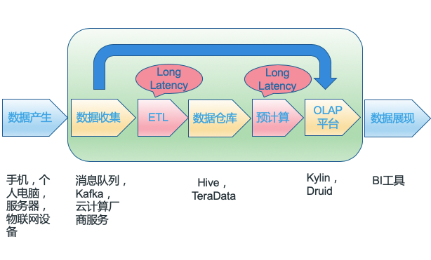 企业数据源类型多样,包括服务器、手机等移动设备、物联网设备等,来自不同源头的消息往往通过不同的主题加以区分,汇聚到消息队列(Message Queue/Message Bus)以供数据分析使用。传统的数据分析工具使用批处理工具如 MapReduce 来进行数据分析,其数据延迟较大,通常为数小时到数天。从下图我们可以看出,主要的数据延迟来自于两个过程:从消息队列通过 ETL 流程抽取到数据仓库,和从数据仓库抽取数据进行预计算将结果加载进 OLAP 系统供分析系统消费。由于这两部分都是使用批处理程序进行计算,计算耗时较长,无法满足实时查询需求,于是我们想到要解决问题只能绕过这些过程,通过在数据收集和 OLAP 平台间架起一道桥梁,让数据直接进入 OLAP 平台。
