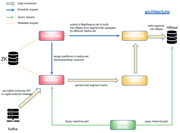 数据流向方面,我们能看到数据的流向是从 Kafka 到 Receiver,再由 Receiver 上传到HDFS,最后由MapReduce 程序合并和重新加工 Segment 进入 HBase。