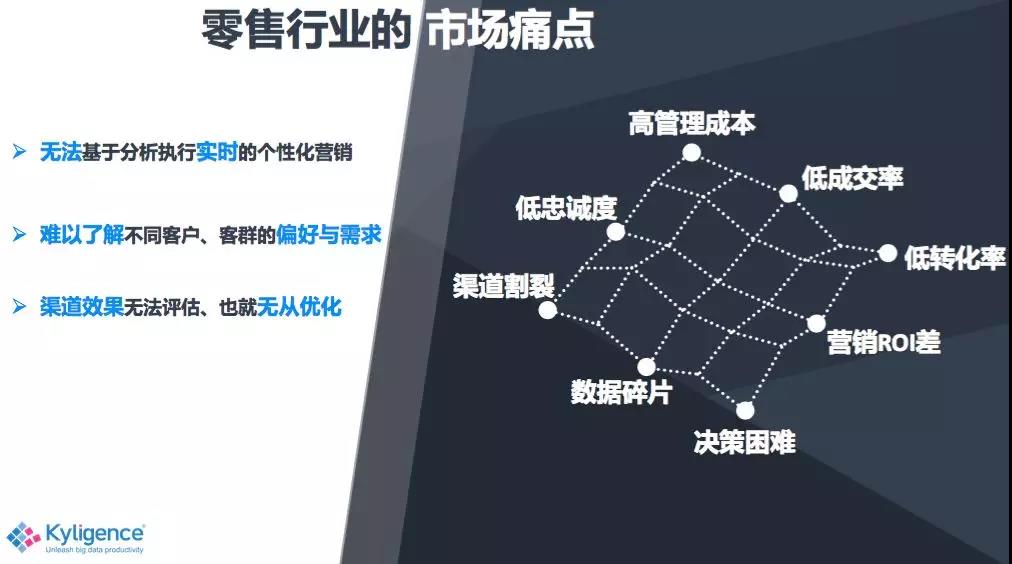 从我之前的项目经验,和现在作为数据厂商跟不同的客户沟通中,发现我们零售行业因为数据问题有很多痛点,比如因为渠道不同而造成消费者体验的一个割裂,这也导致了消费者的忠诚度、成交率和转化率比较低。另外就是因为很多零售企业数字化转型程度还不是很高,所以就会有很多数据碎片,数据口径不一致等问题。也因此带来了管理成本很高,企业的数字化决策困难等等。