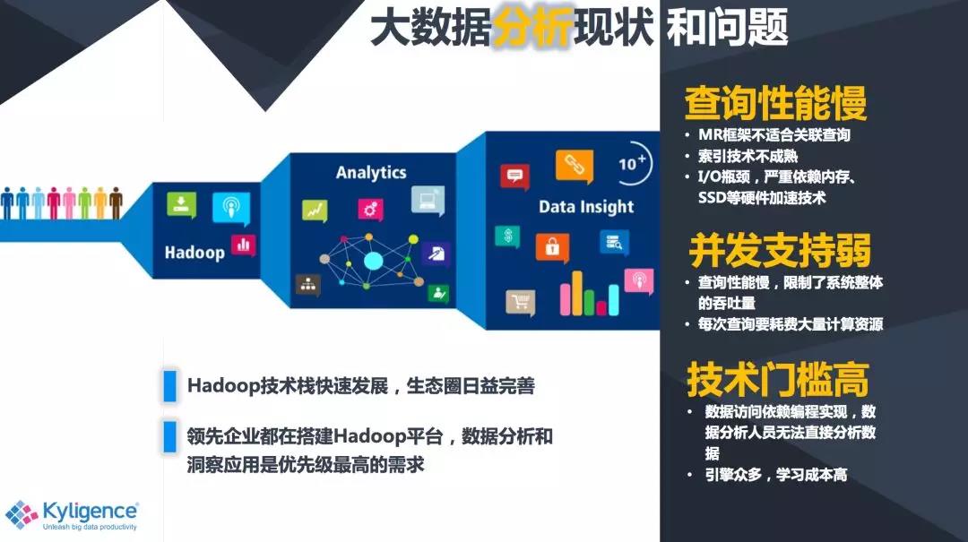 首先说到大数据,离不开的话题肯定是 Hadoop,Hadoop 已经基本成为大数据领域的标配,它的生态系统也比较完善,大家都在各自的 Hadoop 平台上面去实现数据分析和洞察的一些应用。但与此同时呢,其实我们发现了一些问题,比如说查询性能比较慢,对并发支持也很弱等等一些 Haddop 的技术特性所决定的弱点,另外呢就是因为技术门槛高,所以大数据的人才比较难找。