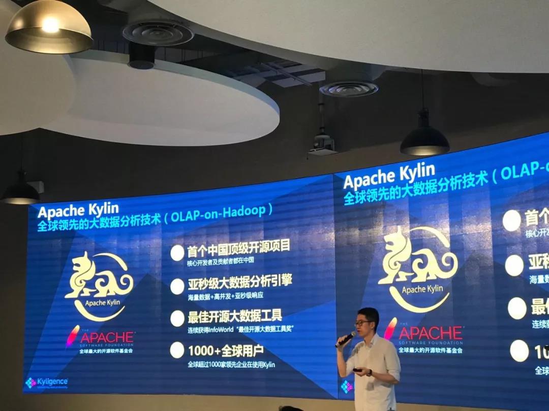 是 Apache Kylin!做技术或者数据圈的应该都知道 Apache 基金会在大数据领域的影响力,比如 Hadoop、Spark 其实都是在 Apache 下面开源的。Kylin 是我们中国第一个从 Apache 毕业的顶级开源项目,作为有独立知识产权的顶级项目,我们也非常自豪,它主要解决的就是前面一直说的大数据分析问题,也就是在海量数据下实现高并发和亚秒级响应。那现在在全球已经有超过 1000 家公司在用 Kylin 作为数据分析的解决方案,这也证明了我们技术的先进性。