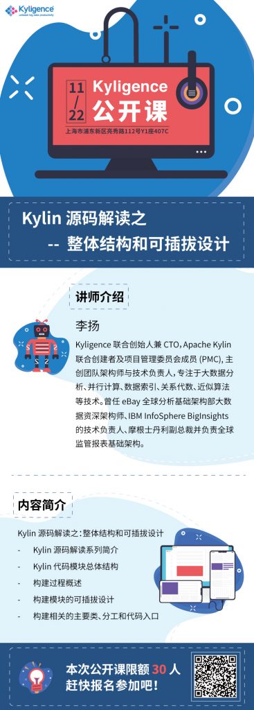 首期课程,我们邀请了 Kyligence 联合创始人兼 CTO 李扬为我们带来《 Kylin 源码解读之:整体结构和可插拔设计》。